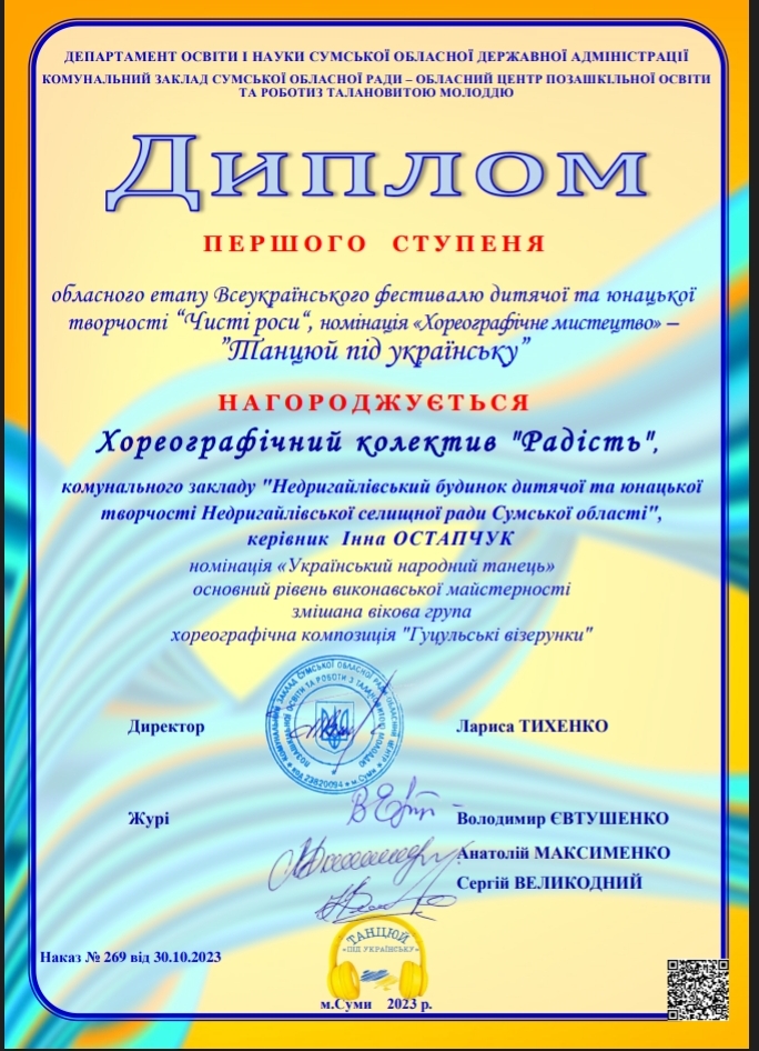 Вітаємо хореографічний колектив «Радість» КЗ «Недригайлівський будинок дитячої та юнацької творчості Недригайлівської селищної ради Сумської області» та його керівника Інну Остапчук з перемогою в обласному етапі Всеукраїнського фестивалю дитячої та юнацької творчості «Чисті роси», номінація «Хореографічне мистецтво» – «Танцюй під українську».